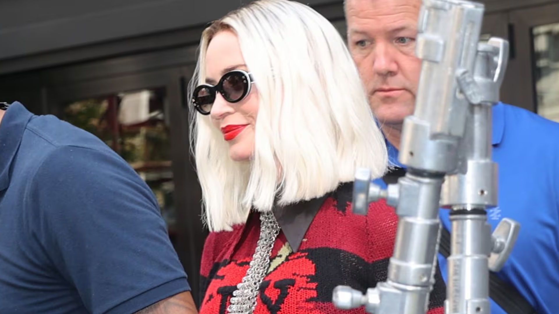 Blunt was seen wearing her shoulder-length blonde bob, complete with a contrasting dark root, together with a red Coach sweater—fashionably torn to style, with letters NY splashed across the front– and chic sunglasses. The actress paired it with a black miniskirt and tights, finishing the look with ankle-length socks and burgundy platform leather loafers.