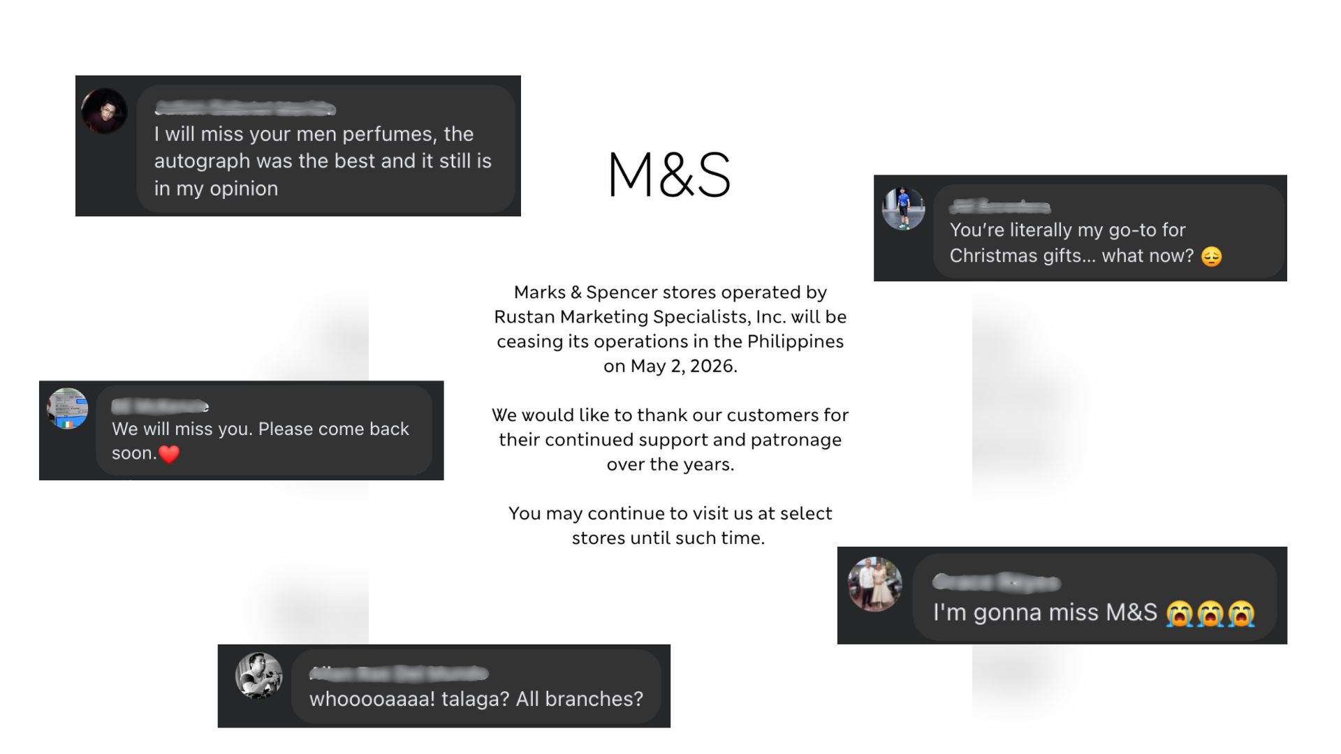 Marks & Spencer stores in the Philippines operated by Rustan Marketing Specialists, Inc. will cease operations on May 2, 2026.